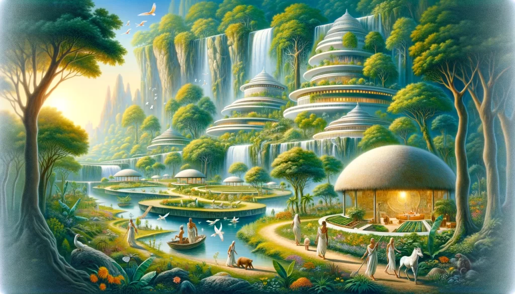 レムリアの文化の中心には、自然との調和がありました。レムリアの住民は、自然界の力を深く理解し、それを尊重しながら生活していました。彼らの建築物や都市計画は、自然環境に配慮して設計されており、エコロジカルな持続可能性が重視されていました。例えば、建物は自然の地形に合わせて配置され、エネルギー効率の高いデザインが採用されていました。また、農業は自然のリズムに従い、季節や天候を考慮して行われ、土壌の健康を維持するための持続可能な農法が実践されていました。