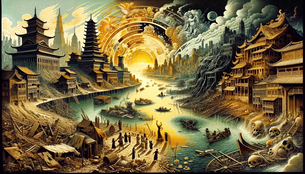 黄河文明の崩壊には、いくつかの要因が考えられます。その一つが気候変動です。黄河流域は、頻繁に洪水や干ばつが発生する地域であり、これらの自然災害が農業生産に大きな影響を与えました。特に長期的な気候変動により、農作物の収穫量が減少し、食糧不足が深刻化しました。