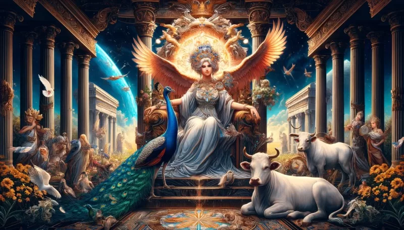 ヘラの象徴としては、孔雀、牛、そして王冠があります。孔雀はその美しい羽がヘラの威厳と美を象徴し、牛は彼女の豊穣と力を表しています。ヘラはしばしば王冠をかぶった姿で描かれ、その権威と威厳を示しています。また、彼女のシンボルには黄金の玉座や聖なる植物であるザクロも含まれます。ザクロは多産と生命の象徴であり、ヘラの豊穣の側面を強調しています。