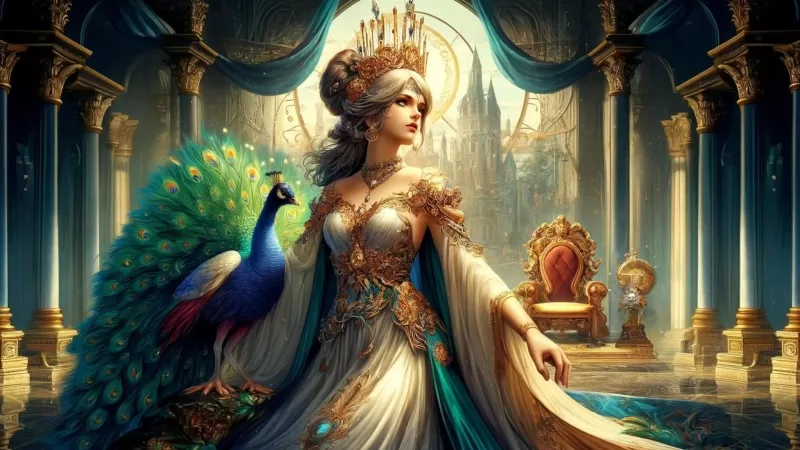 ヘラの象徴としては、孔雀、牛、そして王冠があります。孔雀はその美しい羽がヘラの威厳と美を象徴し、牛は彼女の豊穣と力を表しています。ヘラはしばしば王冠をかぶった姿で描かれ、その権威と威厳を示しています。また、彼女のシンボルには黄金の玉座や聖なる植物であるザクロも含まれます。ザクロは多産と生命の象徴であり、ヘラの豊穣の側面を強調しています。