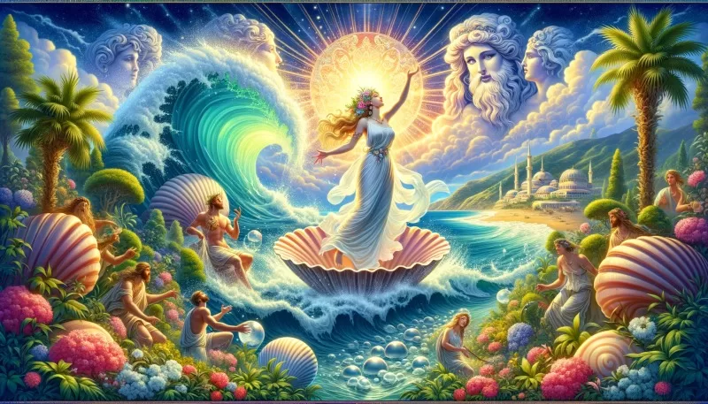 アプロディーテの起源については、複数の説があります。最も有名なのは、彼女がウラノスの切り取られた性器が海に投げ込まれ、その泡から誕生したというものです。この神話は、ヘシオドスの『神統記』に詳述されています。彼女は海の泡から生まれ、美しい姿でキプロス島に上陸しました。この誕生のエピソードは、アプロディーテの神聖な美と魅力を象徴しています。
