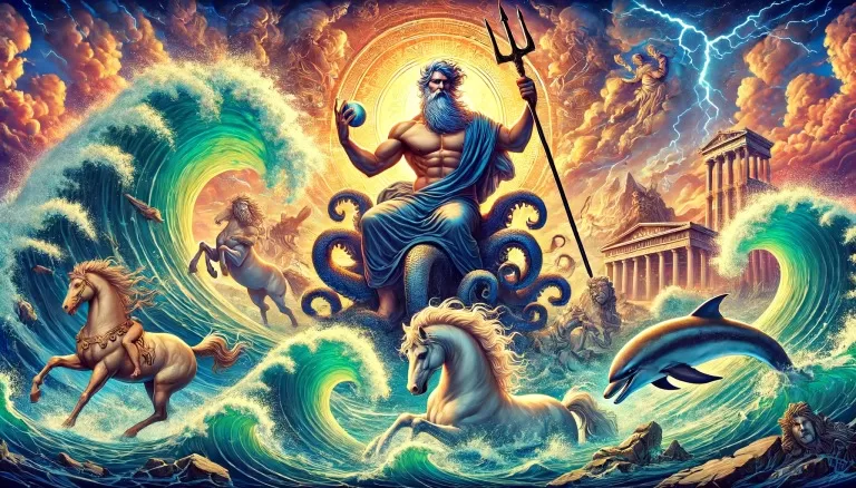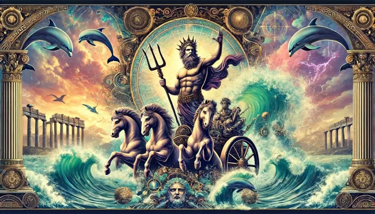 ポセイドンは、海、地震、馬を司る神として広く知られています。彼の象徴としては、三叉の槍、馬、イルカが挙げられます。三叉の槍は彼の力と権威を象徴し、海を支配するための主要な武器として描かれます。また、ポセイドンは馬の創造者ともされており、馬は彼の神聖な動物とされています。
