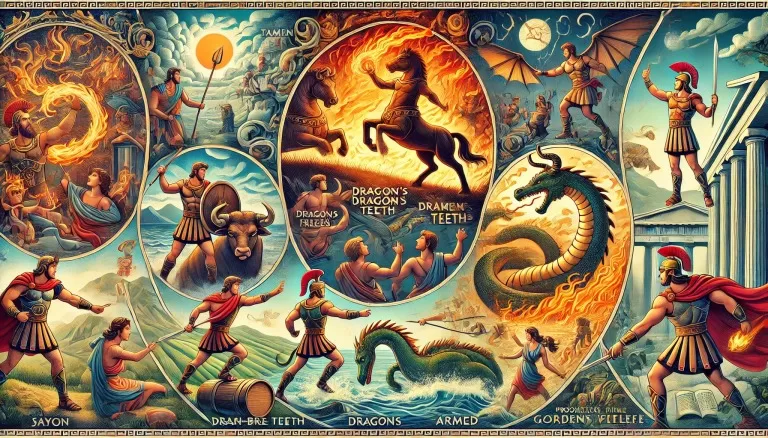 コルキスに到着したイアソンは、金羊毛を手に入れるためにさらに多くの試練に立ち向かいました。コルキスの王アイエテスは、イアソンにいくつかの課題を課しました。彼は、火を吐く雄牛を捕らえ、鋤を引かせて土地を耕し、ドラゴンの歯を蒔くことを命じました。これらの歯からは武装した戦士が生まれ、イアソンは彼らと戦わなければなりませんでした。