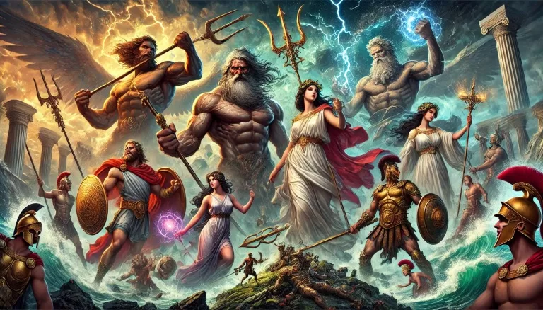 2. ティターンとの戦い: ゼウスは、ティターンとの戦いで雷霆(ケラウノス)を使用し、敵を打ち倒しました。ポセイドンはトライデントを使い、海の力を借りて戦いました。ハデスは、暗黒の力を使い、ティターンの心を恐怖に陥れました。オリンポスの神々は、連携してティターンに立ち向かい、各々の能力を最大限に発揮しました。