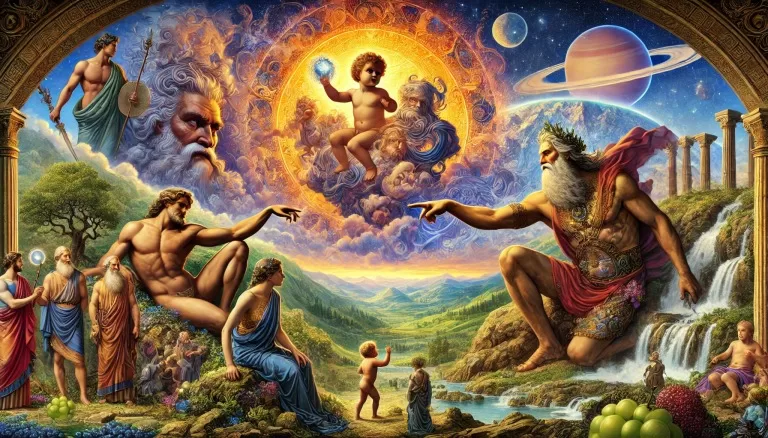2. クロノスの支配: クロノスは、自分の子供たちが成長して自分を打ち倒すという予言を恐れ、生まれた子供たちを次々に飲み込みました。しかし、妻のレアは末子ゼウスを隠し、彼を育てることに成功しました。成長したゼウスは、兄弟姉妹を救出し、ティターンに対抗するための準備を始めました。
